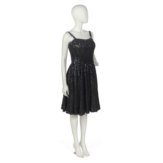 Evening ensemble comprising coat, dress and hat in quilted pewter sequins