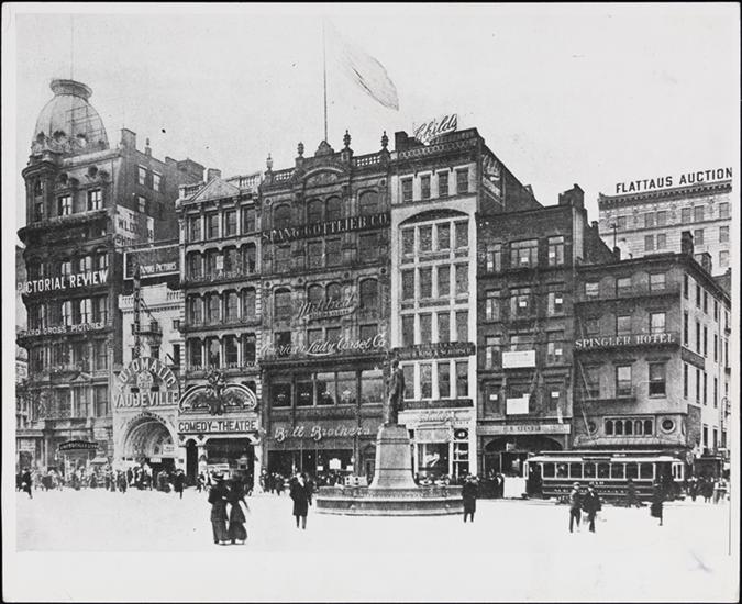 14th Street between Fifth Avenue and Broadway. Commercial buildings and apartments