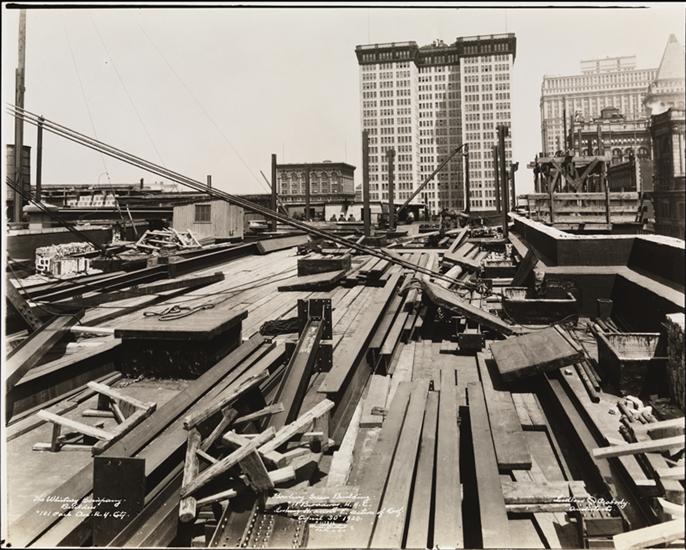 [Bowling Green building 11 Broadway, looking west through north section of roof.]