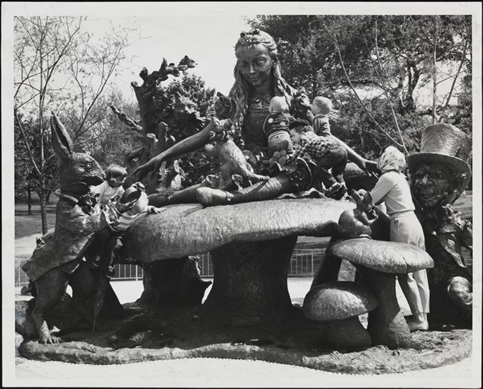 [Little girl sitting on "Alice in Wonderland" sculpture in Central Park.]
