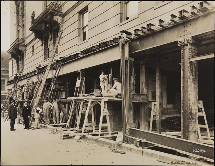 108th Street at the S.W. corner of Broadway. General exterior [shops include a funeral parlor, a laundry, Colonial Restaurant and Lunch, and a tailor.]