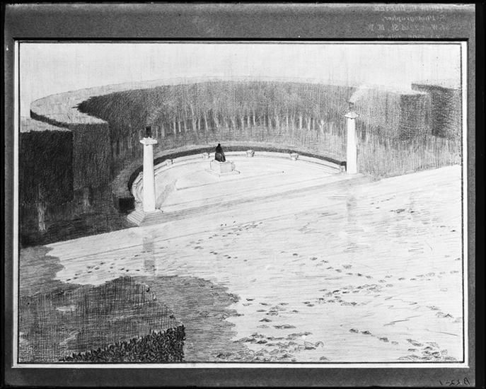 J.G. Monument. Rendered perspective of monument from river up to a statue with two temples.
