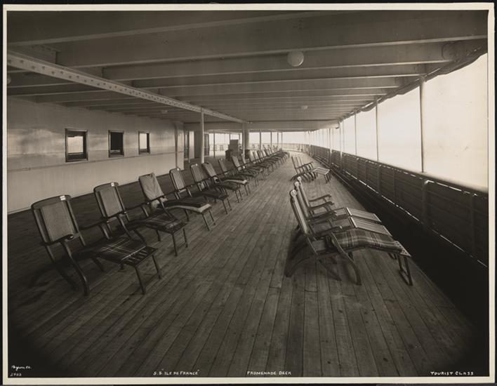 French Line, S.S. "Ile de France", First Class, Exterior, Promenade Deck with Models.