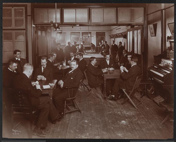 Men playing cards and billiards in a room at St. Thomas' Chapel (Protestant Episcopal) at 230 East 60th Street.