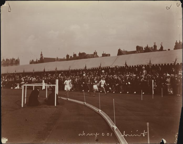 Description Spectators watch track and field athletes at the finish of the 100 yard dash at the Yale/Harvard vs. Oxford/Cambridge meet.