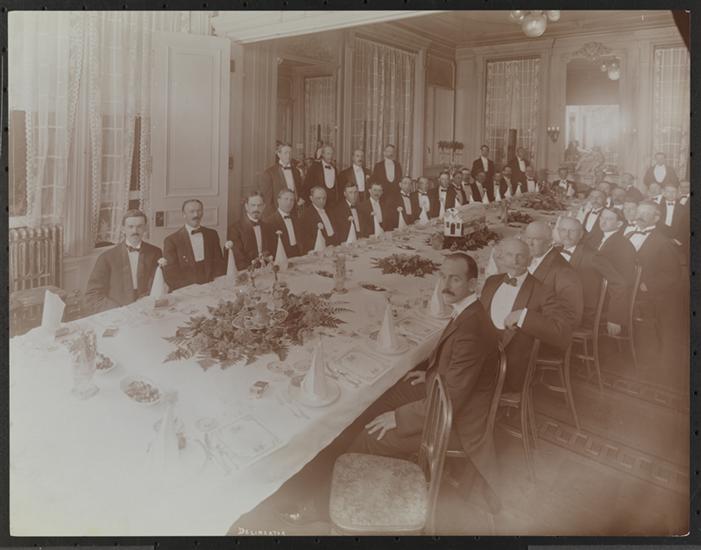 Men seated at a long table at the Delineator dinner.