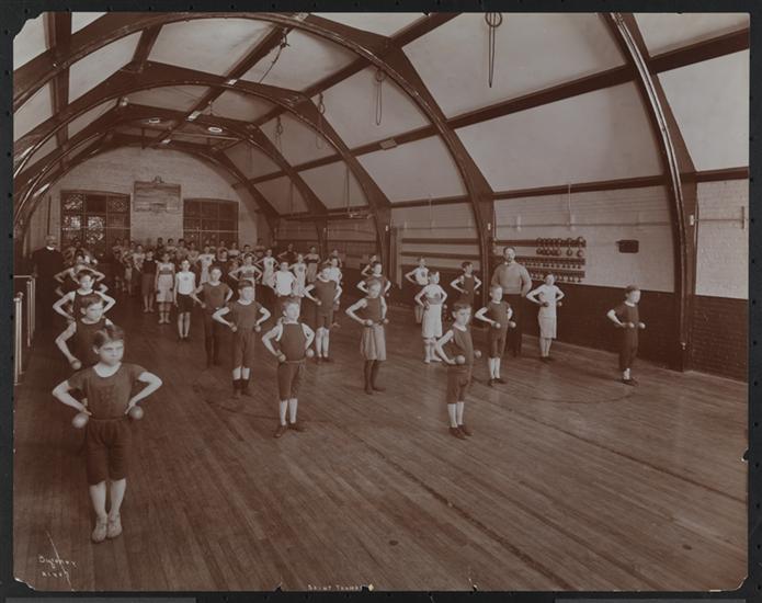 Boys lifting dumbbells in the gymnasium at St. Thomas' Chapel (Protestant Episcopal) at 230 East 60th Street with instructor.