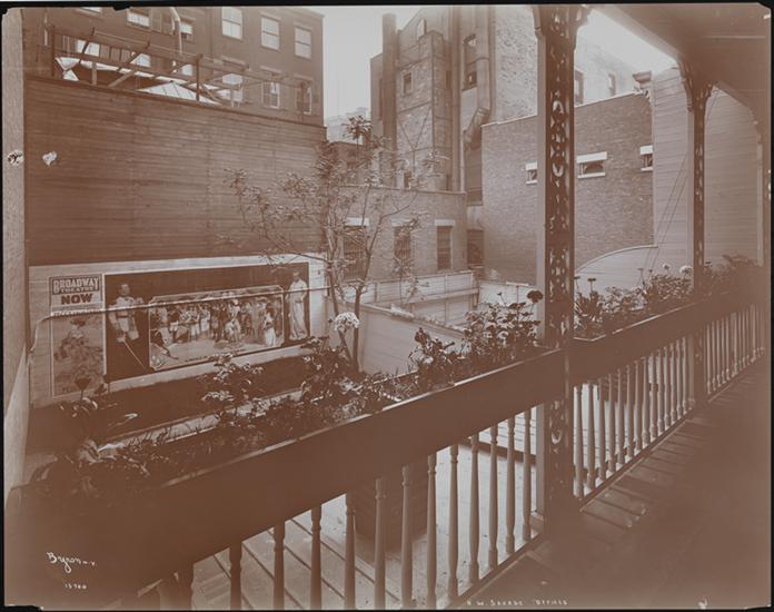 The private roof garden of the offices of H.W. Savage. Broadsides advertising Savage's theatrical productions decorate the garden.