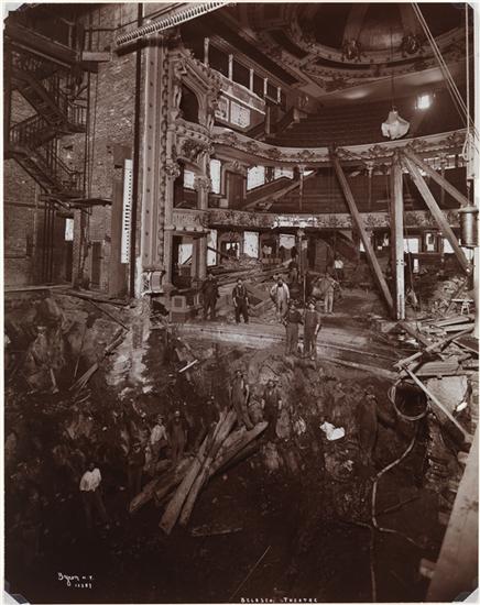 Description Belasco Theatre under construction--shell of old Republic Theatre interior visible.