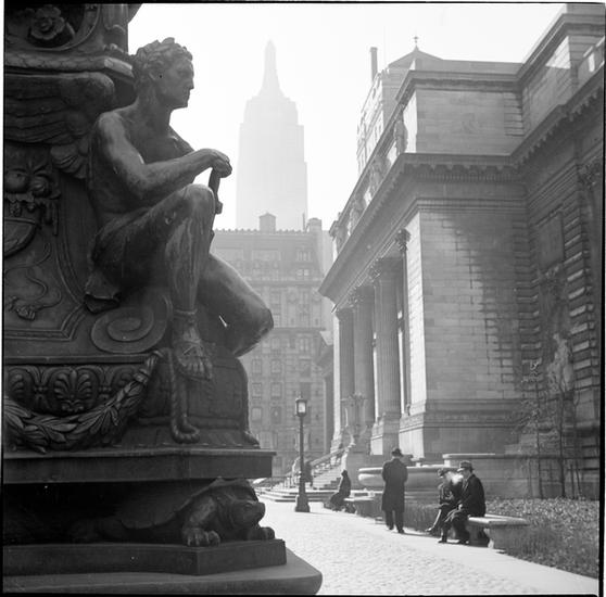 [Looking south from the steps of New York Public Library's main branch toward the Empire State Building.]