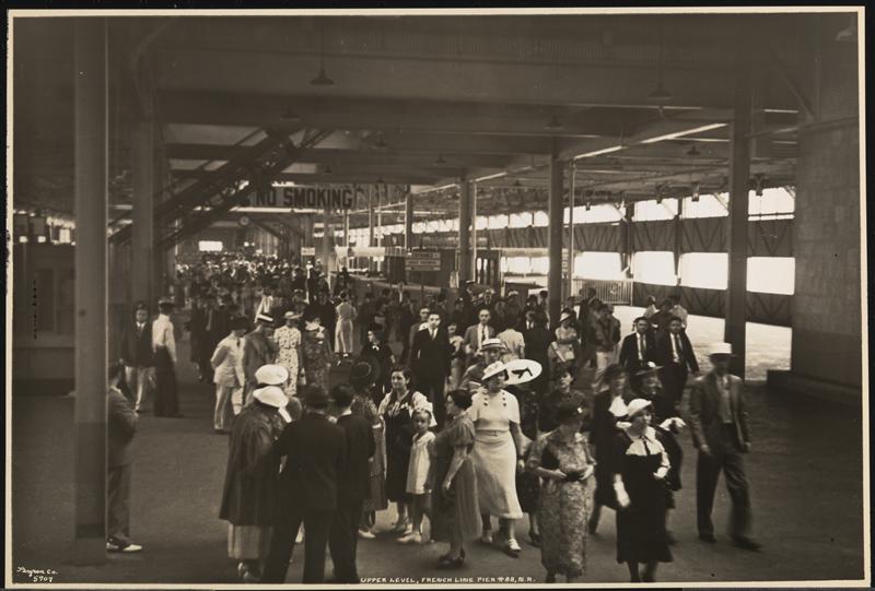 French Line, 610 Fifth Ave., "Normandie" Leaving Pier #88 N.R., Pier Scenes, Passengers Entering Elevators on Upper Level.