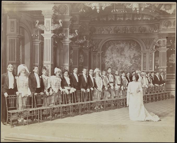 A scene from Owen Hall and Leslie Stuart's musical "The Silver Slipper" presented by John C. Fisher at the Broadway Theatre in 1902 featuring Sam Bernard as Henry Bismark Henschs.