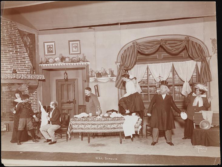 A scene from Weber and Fields' burlesque of Clyde Fitch's translation of Alphonse Daudet's "Sapho" called "Sapolio," a "Clean travesty of 'Sapho'" presented at the Weber and Fields Music Hall in 1900.