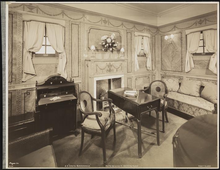 Lloyd Sabaudo Line, S.S. "Conte Biancamano" First Class, Interior, Suite de Luxe F. Sitting Room.