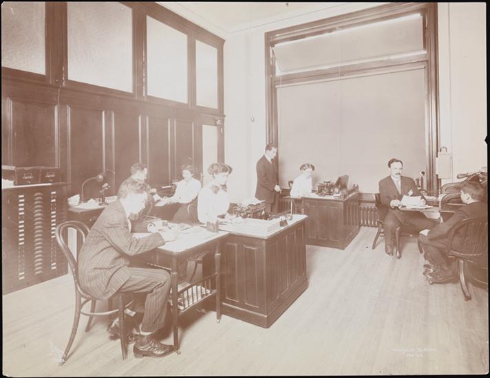 An office at Weingarten Brothers, makers of corsets. Women and men are at work at their desks.