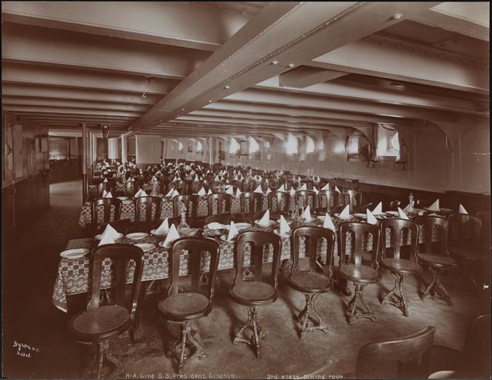 "H-A Line, S.S. President Lincoln, 3rd Class Dining Room" on neg.