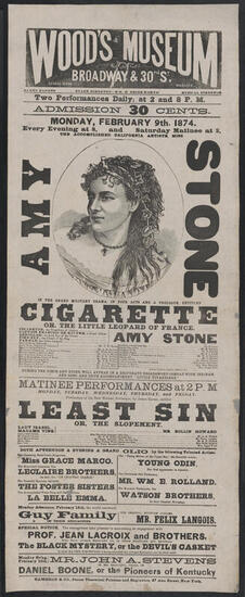 Monday, May 4, 1874, the charming pantomimist and danseuse, Miss Marietta Ravel, in the grand military drama in four acts, entitled "Jartine"