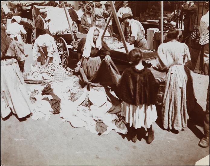 Women shopping, looking through clothes stacked on the ground on Hester Street.