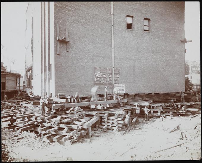 Inscription / technical details "7002/The New Montauk Theatre/Brooklyn/removing the whole structure/200 feet" in pencil on verso.