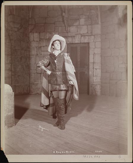 A scene from Gerald du Maurier's "A Royal Rival" presented by Charles Frohman at the Criterion Theatre in 1901-1902, featuring William Faversham as Don Cesar de Bazan and Julie Opp as Marita.