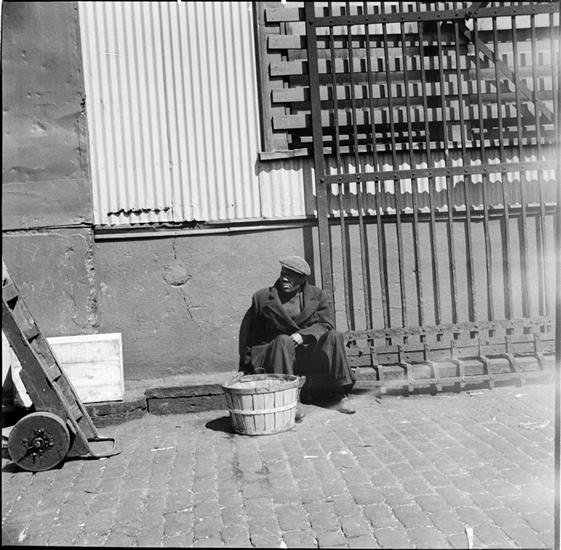 Waterfront. [Portrait of a man seated on the street.]