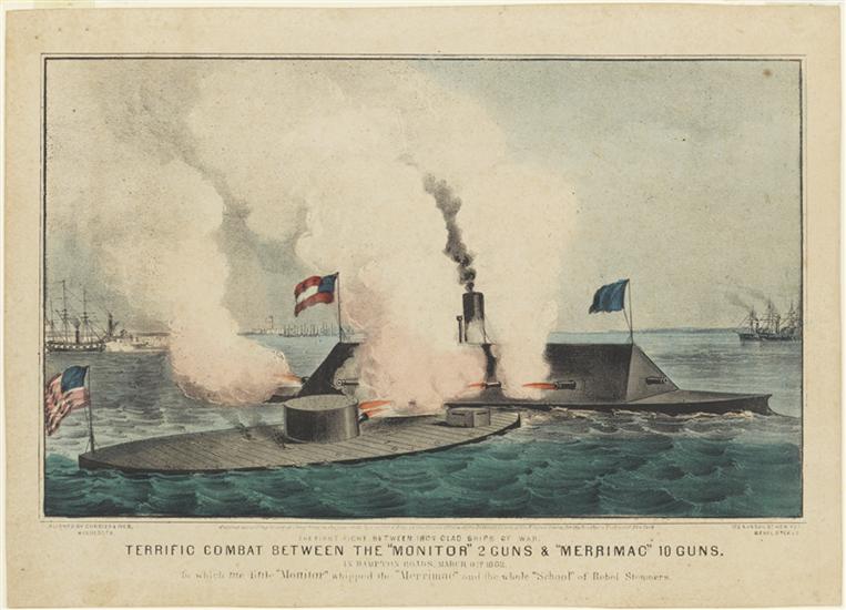 Terrific Engagement Between the "Monitor" 2 Guns, and "Merrimac" 10 Guns, in Hampton Roads, March 9th 1862.