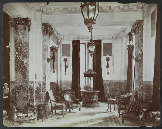 "Hotel Belmont, Loby" on neg (should be "Lobby"). | Photographer's stamp on verso, including credit line and permission to publish.