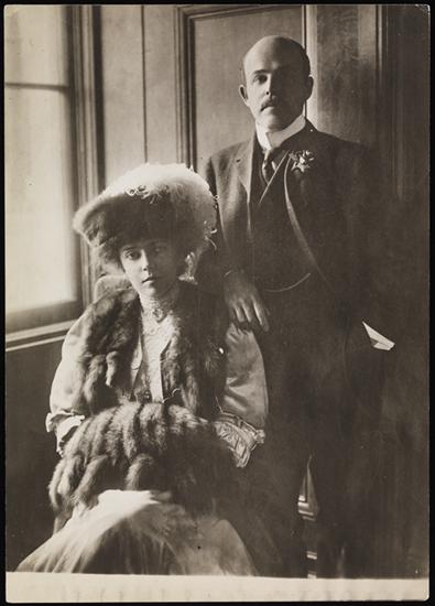 Alice Roosevelt Longworth and Nicholas Longworth in the White House in Washington, D.C. She is seated and wears a dress with a fur hat, stole and muff.
