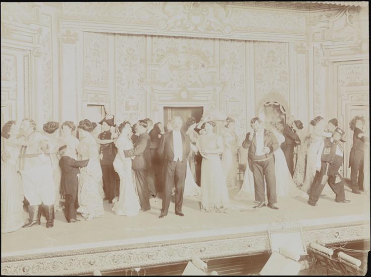 A scene from Weber's Burlesque of the Henry W. Savage production of Lehar's "The Merry Widow" and a production of "The Devil," presented at Webers Theatre in 1909.