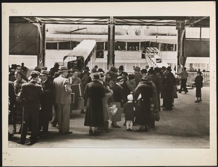 French Line, 610 Fifth Ave., "Normandie" Leaving Pier #88 N.R., Pier Scenes, Passengers Entering Elevators on Upper Level.