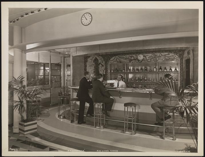 French Line, S.S. "Normandie", Pier #88 N.R., Interior, 1st Class, Cafe Grill Bar.