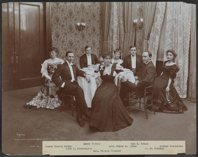 Group posed at a table at the dinner given to Mark Twain in honor of his 70th birthday at Delmonico's. This group is "Table M," including Nancy Huston Banks, John T. McCutcheon, Emery Pottle, Mrs. Wilson Woodrow, Mrs. Henry M. Alden, Rex E. Beach, C. De Fornaro and Louise Forsslund.