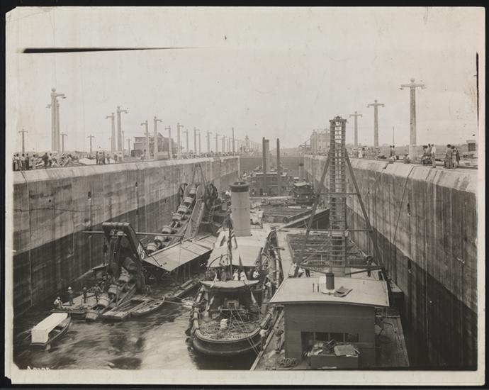 Barges in the Panama Canal under construction; duplicate print labeled "Upper Lock at Lake Gatun looking toward Lake Gatun, tugs, dredges, barges, etc. making first lockage into Lake Gatun."