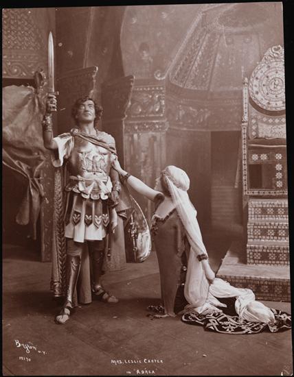 Mrs. Leslie Carter as Adrea and Tyrone Power as Arkissus of Frisia in "Adrea" by David Belasco and John Luther Long, presented at the Belasco Theatre, Broadway and 42nd Street, New York, circa 1905.