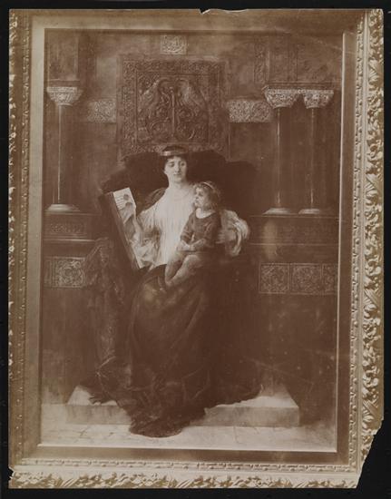 Photograph of a portrait painting of a woman in a throne holding a child.