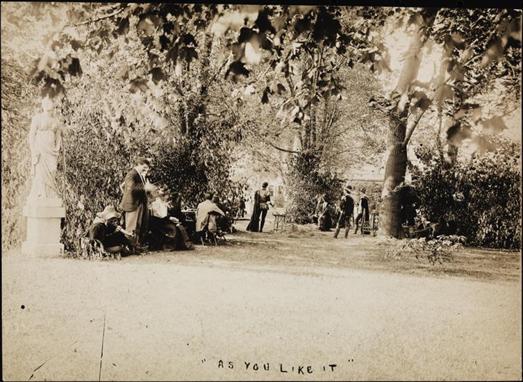 Actors in an open air production of William Shakespeare's "As You Like It" presented on the grounds of what may be the Stevens Residence, Hoboken, N.J.