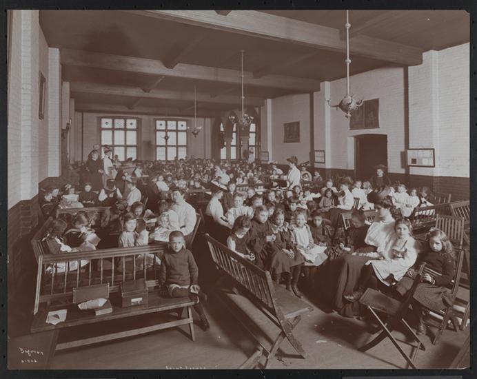 Young girls and boys sitting on benches at tables practicing sewing in a room at St. Thomas' Chapel (Protestant Episcopal) at 230 East 60th Street with adults supervising.