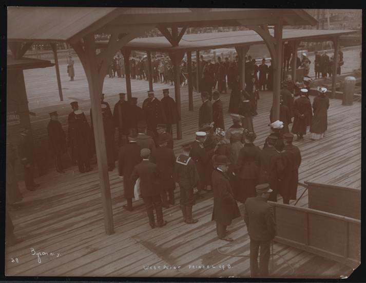 Prince Louis of Battenberg being introduced to officers at West Point upon his arrival at the dock.