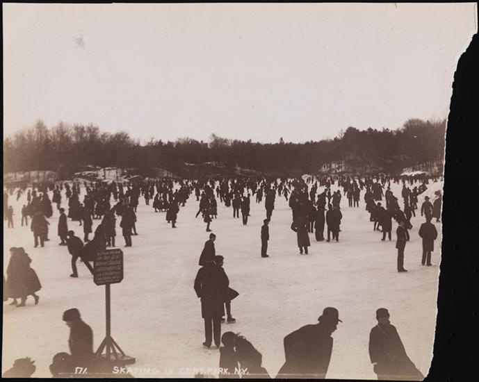 "1870 by Johnston" inscribed in pencil on print verso. | "J.S. Johnston / Photography / New York" in embossed stamp on print verso. | "171. Skating in Cent. Park, N.Y." inscribed on negative, print re