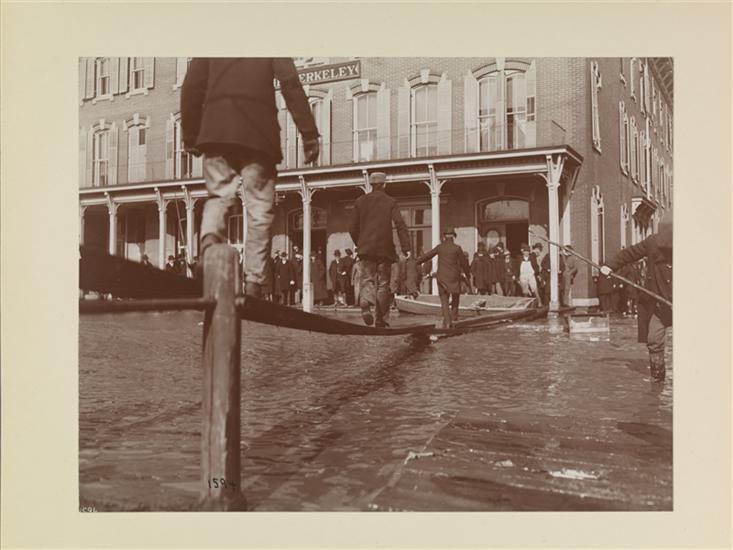 Three men walking over a make-shift bridge over the flooded Main Street in Bound Brook, N.J.