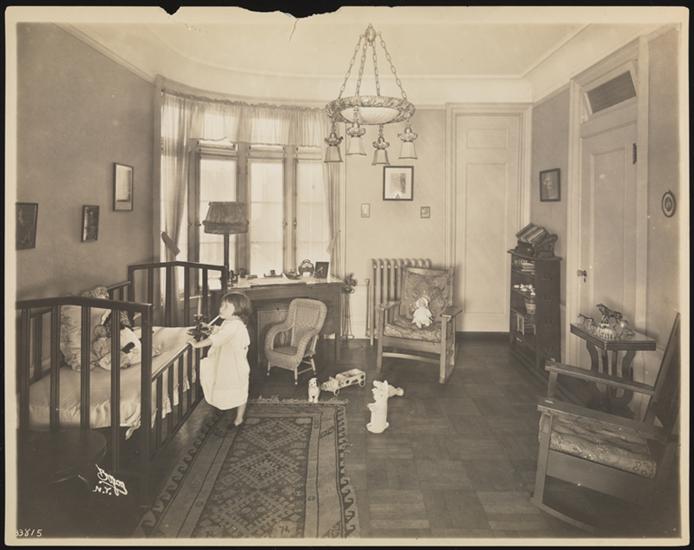 A girl holding a candle, climbing into a crib, in a bedroom of the A.C. Cronin residence.