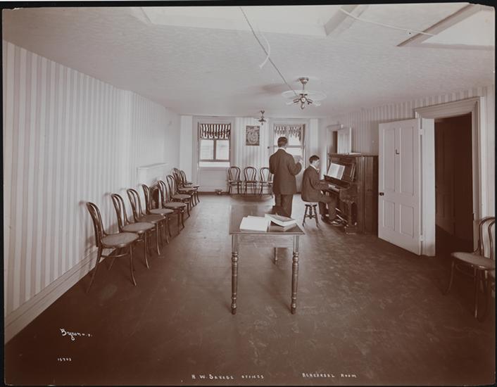 Two men rehearsing at a piano in a room on the fourth floor of the offices of H. W. Savage.