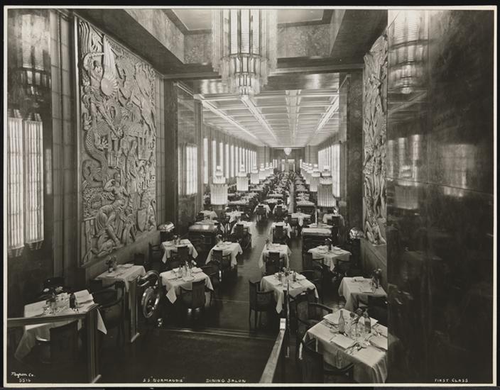 French Line, S.S. "Normandie", Pier #88 N.R., Interior, Dining Salon Looking Aft.