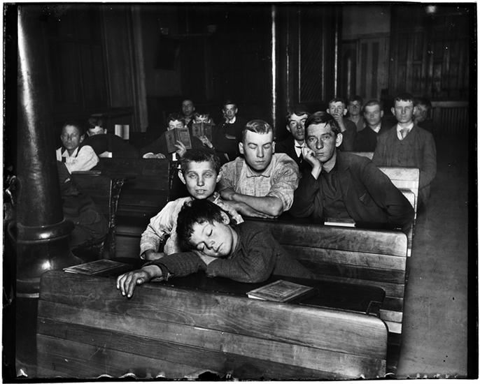Night school in the west side lodging house. Edward, the little pedlar, caught napping.